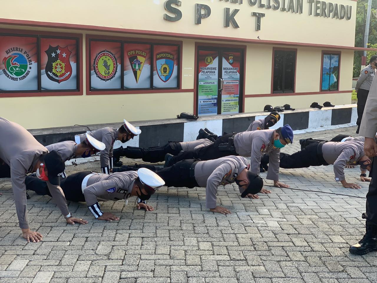 Belasan personil Polda Sulbar menerima sanksi dari Bid Propam Polda Sulbar saat pemeriksaan penggunaan masker di lapangan apel Mapolda Sulbar pada hari Rabu (19/08/20).
