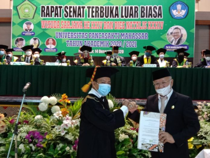Bupati Jeneponto Iksan Iskandar, Kepala Lembaga Layanan Pendidikan Tinggi (LLDIKTI) Wilayah IX Prof Jasruddin Malago, serta Kepala Stasiun TVRI Sulsel, dan Dirut PT Ismut Fitomedika Indonesia, turut menghadiri Rapat Senat Terbuka Luar Biasa dalam rangka Wisuda Sarjana ke-24 dan Dies Natalis ke-34 Universitas Pancasakti (Unpacti) Makassar, di Balai Manunggal TNI-Rakyat, Jl Sultan Hasanuddin, Makassar, Senin, 14 Desember 2020.