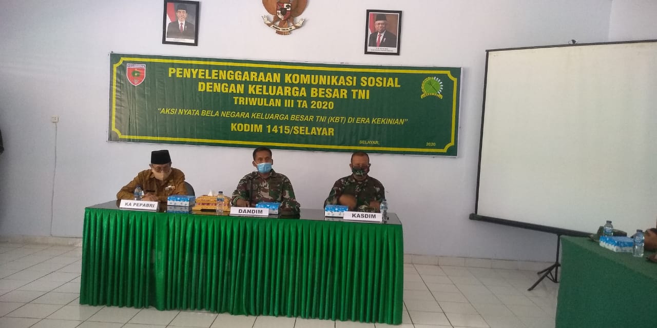 Bertempat di Aulah Makodim 1415 / Selayar, Jumat, 25/9/2020, berlangsung pertemuan antara Komandan Kodim 1415/ Selayar dengan keluarga besar TNI se Kabupaten Kepulauan Selayar. Hadir dalam acara ini, Dandim 1415/Selayar Letkol Kav, Adi Priyatna, Kasdim 1415/Selayar, Mayor Inf. A. Rasyid, Ketua Pepabri Selayar, Pur, Kapten, H.Abd.Patta, serta, Purnawirawan TNI, Ketua Persit KCK, Cabang XXIX Kodim 1415/Selayar dan anggota Persit KCK. Kodim 1415/Selayar. Hadir pula Ketua FKPPI Selayar, Suharto, dan anggota FKPPI,