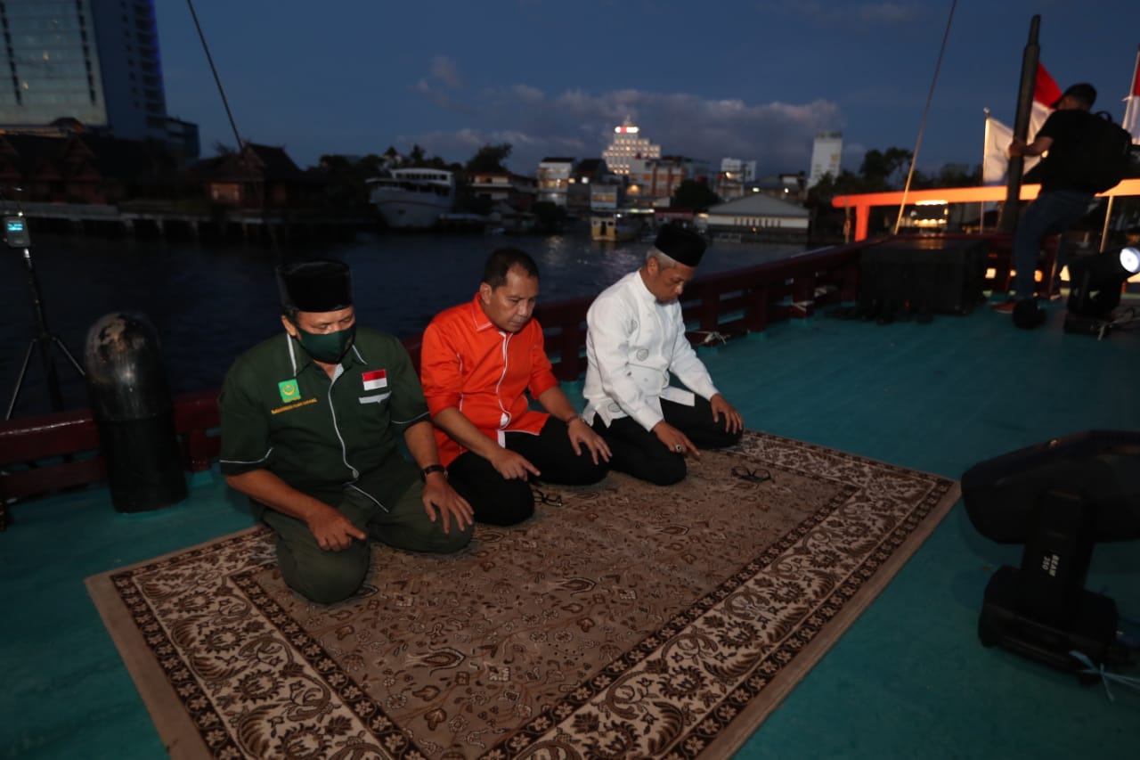 Bakal Calon Wali Kota Makassar, Moh. Ramdhan ‘Danny’ Pomanto menggelar sholat magrib berjamaah diatas kapal phinisi, usai menggelar deklarasi, Kamis (03/09/2020).