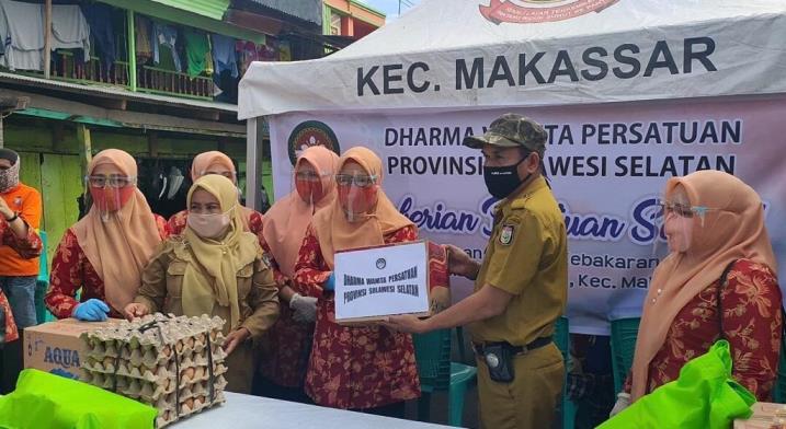 Dharma Wanita Persatuan, Provinsi Sulawesi Selatan (DPW-Sulsel) menyalurkan bantuan bagi korban kebakaran Maccini Gusung, di Posko Bencana Kebakaran Kelurahan Maccini Gusung, Senin, 6 Juli 2020.
