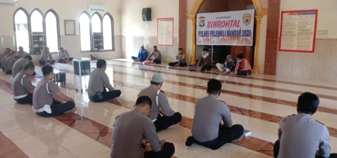 Di masa pandemi Covid-19 Personel Polres Polman Polda Sulbar tetap melaksanakan kegiatan pembinaan rohani dan mental (Binrohtal) yang berlangsung di mesjid Al Hisbah Polres Polman, Kamis (05/11/2020) pagi ini.