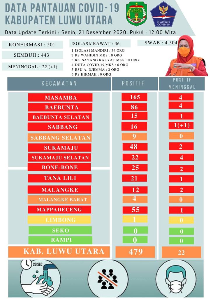 Innalillahi Wa Innailahi Rojiun, dua warga Luwu Utara meninggal karena terpapar Covid-19, sebelumnnya, Sabtu 19 Desember, Warga Kec Baebunta dinyatakan meninggal dunia, kemudian pada Minggu 20 Desember satu lagi yang meninggal beralamat di Kec Sabbang.