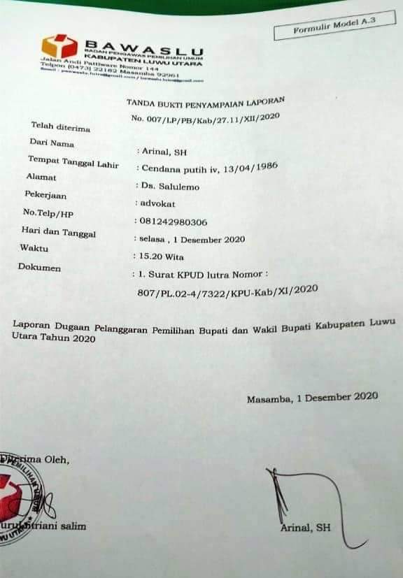 Sekretaris Tim Paslon nomor urut 3 Arsyad Kasmar-Andi Sukma akhirnya melaporkan Pasangan Calon (Paslon) nomor urut 2 Indah-Suaib ke Badan Pengawas Pemilu (Bawaslu) Luwu Utara, Selasa 1 Desember 2020.