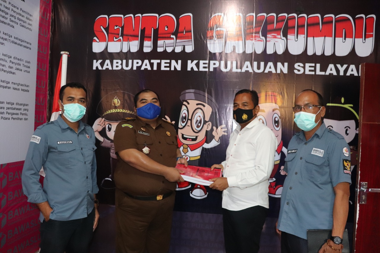 Senin, (19/10/20) Kepala Unit Reserse dan Kriminal (Kanit Reskrim) Kepolisian Resor (Polres) Kepulauan Selayar, Ipda Suhardiman, SH, MM telah menyerahkan berkas perkara hasil penyidikan kepada Jaksa Penuntut Umum (JPU) Kejari Selayar, Andi Trismanto, SH diruang Sentra Gakkumdu Kepulauan Selayar, Jl Dr Sam Ratulangi Kelurahan Benteng Selatan tadi siang. Pelimpahan berkas itu selain disaksikan oleh Ketua Badan Pengawas Pemilihan Umum (Bawaslu), Suharno, SH juga disaksikan oleh salah seorang komisioner Bawaslu, Abdul Kadir selaku pembina Sentra Gakkumdu.