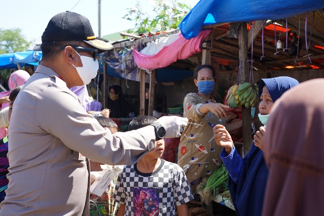 Gerakan ini menyesar tempat-tempat keramaian salah satunya pasar baru Mamuju. Selain bagi-bagi masker, vitamin dan sembako juga dilakukan penyemprotan disinfektan di tempat-tempat sarana umum. (humas polda sulbar-sabar)