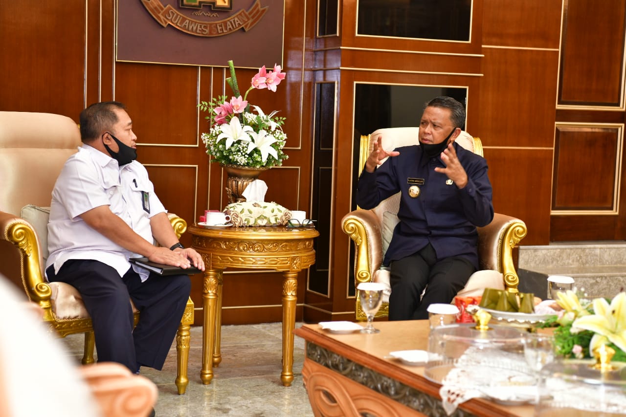 Gubernur Sulawesi Selatan (Sulsel), Prof HM Nurdin Abdullah, menerima Kepala Balai Prasarana Pemukiman Wilayah Sulsel, Ahmad Asiri, di Kantor Gubernur Sulsel, Jalan Urip Sumoharjo Makassar, Senin, 20 Juli 2020.