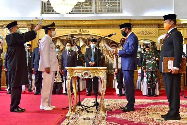 Gubernur dalam sambutannya menyampaikan rasa syukurnya pelantikan dapat dilakukan dengan lancar. Pelantikan ini juga dalam rangka lebih mengoptimalkan kinerja dalam rangka penanganan Covid-19 dan menghadapi pandemi ini.