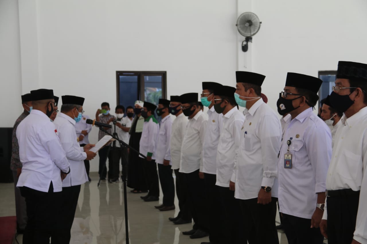 Gubernur Sulbar Ali Baal Masdar didampingi Bupati Polman, Andi Ibrahim Masdar, mengukuhkan Pimpinan Daerah Dewan Masjid Indonesia (DMI) Polman masa bakti 2020-2025, di tribun rumah jabatan Bupati Polman, Rabu 16 September 2020.