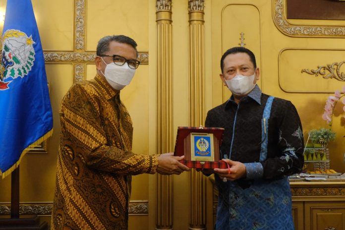 Gubernur Sulawesi Selatan, Prof. HM Nurdin Abdullah dan Sekprov Sulsel, Abdul Hayat Gani menyambut kedatangan Ketua MPR RI, Bambang Soesatyo (Bangsoet) di Rumah Jabatan Gubernur, Sabtu malam, 19 Desember 2020.