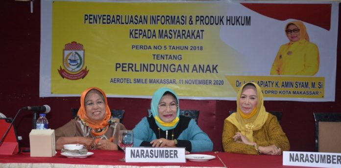 Untuk itu, anggota DPRD Kota Makassar, Dr.Ir.Hj.Apiaty K Amin Syam,M.Si menggelar sosialisai Penyebarluasan Informasi dan Produk Hukum kepada masyarakat, khususnya tentang Peraturan Daerah (Perda) No 5 tahun 2018, tentang Perlindungan Anak. Sosialisasi yang berlangsung di Aerotel Smile Makassar, Rabu 11 November 2020 itu juga menghadirkan dua pemateri yang ahli dalam bidang perlindungan anak.