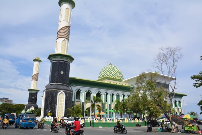 Dua menaranya dipadu kubah kecil mirip kubah induk setinggi 44 meter mempercantik masjid seluas 9512 meter persegi berdaya tampung 15 ribu jamaah itu. Dua menara lainnya dari arah laut ‘tumbang’ dan kini belum diperbaiki.