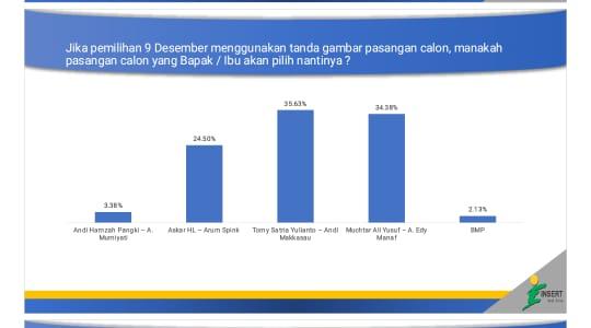 Reskiyanti, Direktur Riset Insert Institut mengatakan, jika Pilkada Bulukumba digelar hari ini, Pasangan Tomy Satria Yulianto – Andi Makkasau (3) memperoleh dukungan responden 36,63% unggul tipis dengan Paslon Muhtar Ali Yusuf – Edy Manaf (4) yang peroleh dukungan responden 33,13% atau selisih 1,25%.