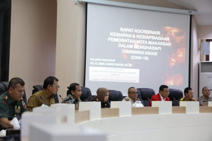 Pemerintah Kota Makassar menggelar rapat koordinasi, sekaitan dnegan penyebaran virus corona. Hadir  di antaranya, Ketua PMI Kota Makassar yang juga mantan Walikota Makassar (Syamsu Rizal MI), perwakilan Kantor Kementerian Agama, Forum Kementerian Agama, Ikatan Dokter Indonesia, UNICEF perwakilan Makassar, Forum CSR Kota Makassar, serta Direktur Perusda Kota Makassar.