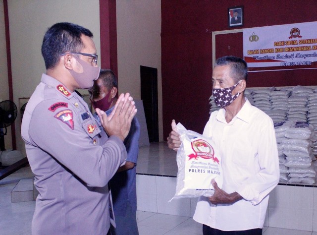 Mengawali kegiatan bakti sosial tersebut Kapolres Majene AKBP Irawan Banuaji, SIK, menyerahkan secara simbolis bantuan beras kepada warga masyarakat kurang mampu di aula Wira Pratama Polres Majene.