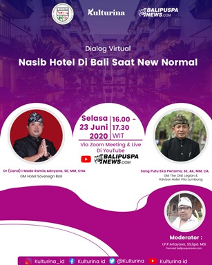 Media siber balipuspanews bekerjasama dengan kulturina dan Indonesia Hotel General Manager Association (IHGMA) mengadakan dialog virtual dengan mengangkat tema, Nasib Hotel di Bali saat New Normal. Sebelumnya diketahui Provinsi Bali akan mulai melaksanakan tatanan hidup baru atau new normal dimana tahap awalnya akan dilaksanakan pada, Kamis (9/7/2020) depan.