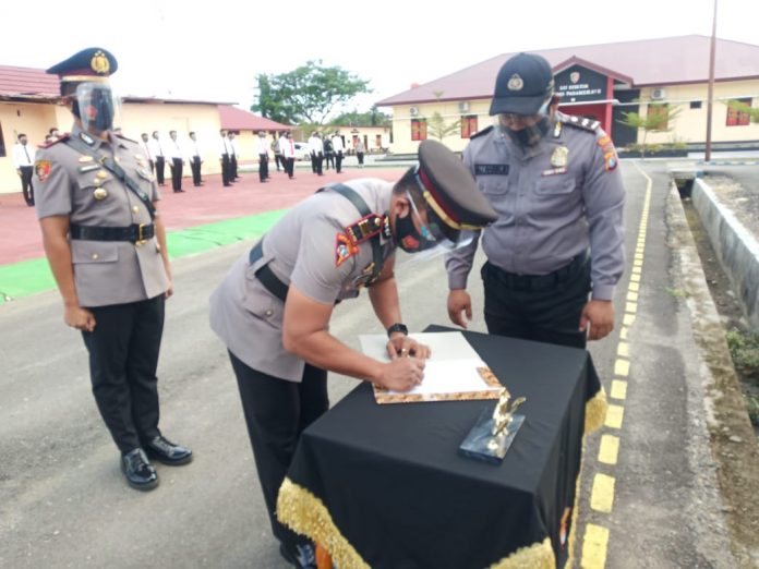 Kapolres Pasangkayu AKBP Leo H.Siagian S.I.K, M.Sc pimpin serah terima jabatan Kapolsek Baras Polres Pasangkayu dari AKP Rigan Hadi Nagara S.I.K ke IPTU Agung Setyo Negoro, S.T.K, Senin (19/10/2020).