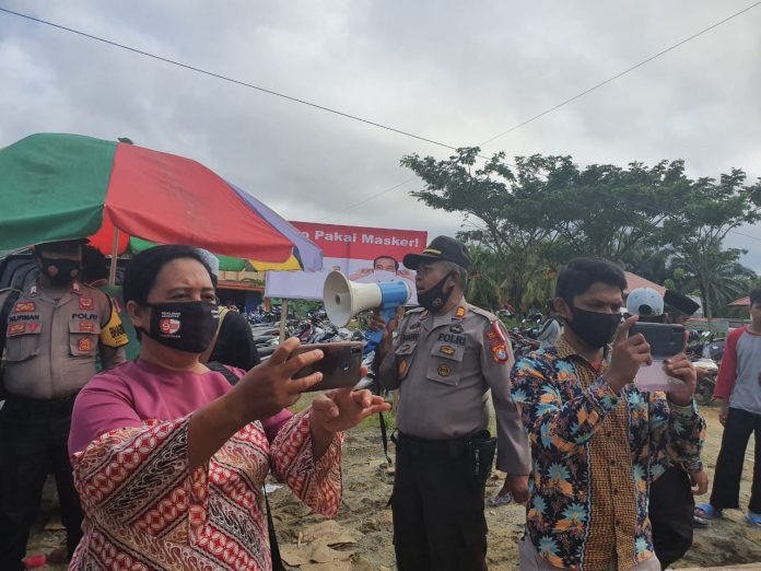 Kapolsek Pasangkayu Akp Sujarwo S.HÂ didampingi oleh Camat Pedongga Amos S.Sos Kampanye Ayo gunakam Masker di Pasar Kecamatan Pedongga Dusun Kesuma Negara Kec.Pedongga, Kamis pagi (10/9/2020).