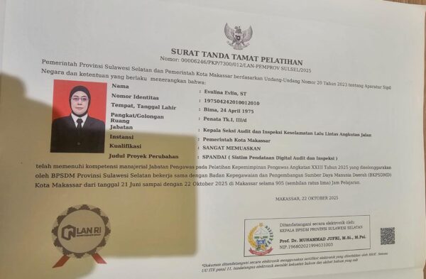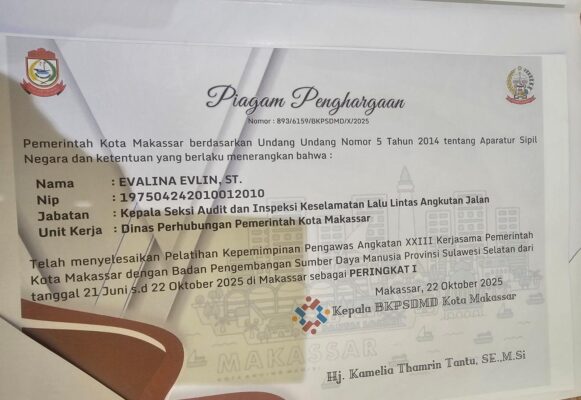 Evalina Evlin, ST  meraih prestasi membanggakan. Tak tanggung tanggung, Kepala Seksi Audit dan Inspeksi Keselamatan Lalu Lintas Angkutan Jalan, Dinas Perhubungan Kota Makassar ini meraih peringkat pertama pada Pelatihan Kepemimpinan Pengawas (PKP) Angkatan XXIII Tahun 2025.