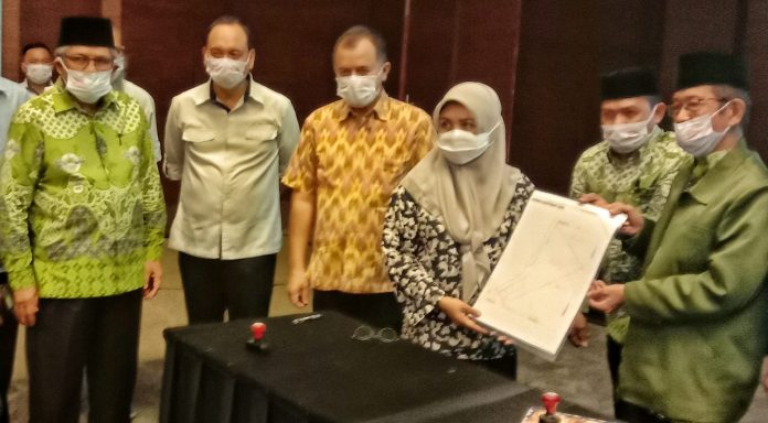Penyerahan tanah hibah dilakukan Hj. Fatimah Kalla selaku Ketua Yayasan Hadji Kalla dan diterima Pengurus Cabang Nahdlatul Ulama (PCNU) Kota Makassar Anregurutta Dr.KH. Baharuddin AS, MA., Senin (7/12/20), di Lantai 9 Wisma Kalla.