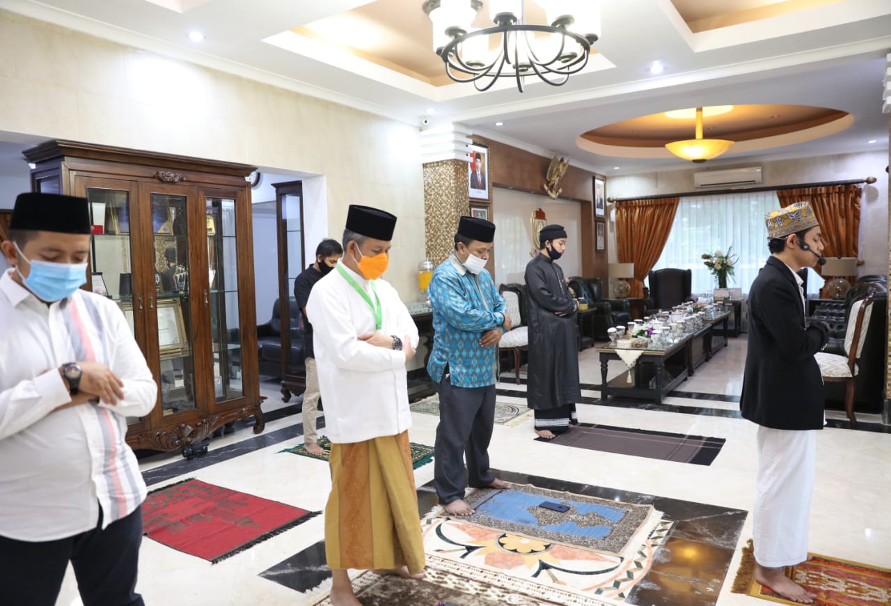 Penjabat Walikota Makassar, Prof Yusran Jusuf melaksanakan shalat Ied bersama keluarga di rumah jabatan Walikota Makassar,  Ahad, 24 Mei 2020. Penjabat Walikota pasca M Iqbl Suhaeb ini khusyuk menunaikan ibadah bersama istri, anak dan juga sejumlah pegawai yang bertugas di rumah jabatan walikota Makassar. Shalat Ied bersama dengan memperhatikan social distancing. Ustad Muhammad Abdillah Arfa membawakan khutbah.