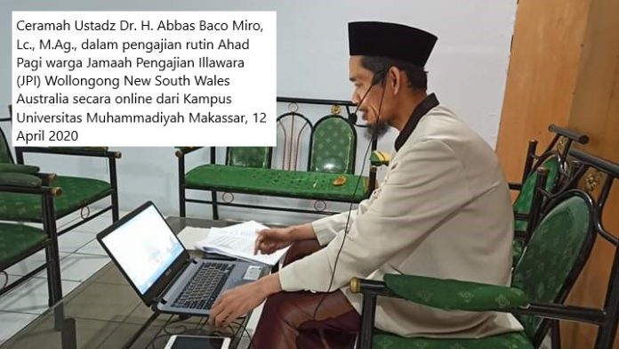 Selama satu jam mulai jam 06.00 waktu Australia, Ketua Prodi Komunikasi Penyiaran Islam Fakultas Agama Islam (KPI FAI) Unismuh Makassar, Ustadz Dr. H. Abbas Baco Miro, Lc., M.Ag, bawakan pengajian online di Australia, Ahad pagi (12/4/2020).