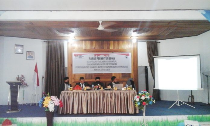 Rapat pleno terbuka, rekapitulasi hasil verifikasi faktual (verfak) dukungan bakal pasangan calon (bapaslon) perseorangan, dalam pemilihan bupati dan wakil bupati Kabupaten Kepulauan Selayar tahun 2020, dihelat secara resmi oleh jajaran Komisi Pemilihan Umum (KPU) Kabupaten Kepulauan Selayar, Sulawesi-Selatan, hari, Senin, (20/07), bertempat, di gedung PKK, Jln. Muh. Krg. Bonto, kota Benteng.