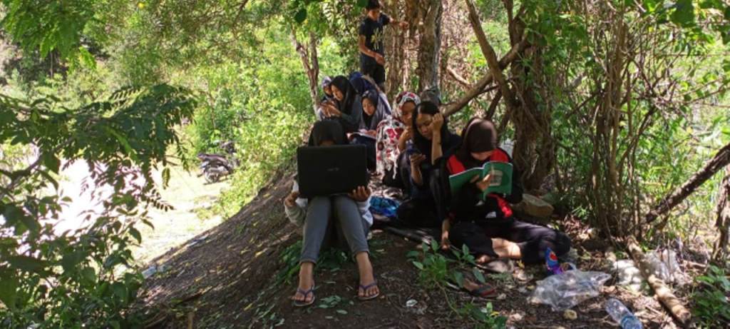 Mahasiswa dari berbagai kampus asal Desa Tallu Bamba, jika bertepatan jadwal kuliah online ramai-ramai menuju bukit dibawah pepohonan yang rimbun mencari jaringan dan duduk bersila di tanah mengikuti kuliah dan mengerjakan tugas secara online.