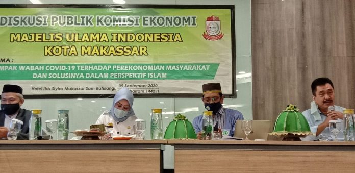 Majelis Ulama Indonesia (MUI) Kota Makassar menggelar diskusi publik dengan topik utama “Dampak wabah Covid-19 terhadap perekonomian masyarakat dan solusinya dalam perspektif Islam” menghadirkan narasumber Dr. Ir. H. Andi Yusran Paris,MM, MBA.(Ketua Umum Ikatan Saudagar Muslim Indonesia Sulsel), Dr. Ir. H. Idris Parakkasi,MM, CPHCM. (Akademisi Ekonomi dan Keuangan Syariah), dan Evy Aprialti,SE,MM. (Kepala Dinas Koperasi dan UKM Kota Makassar), Rabu (09/09/20), di Hotel Ibis Jalan Dr. Ratulangi.