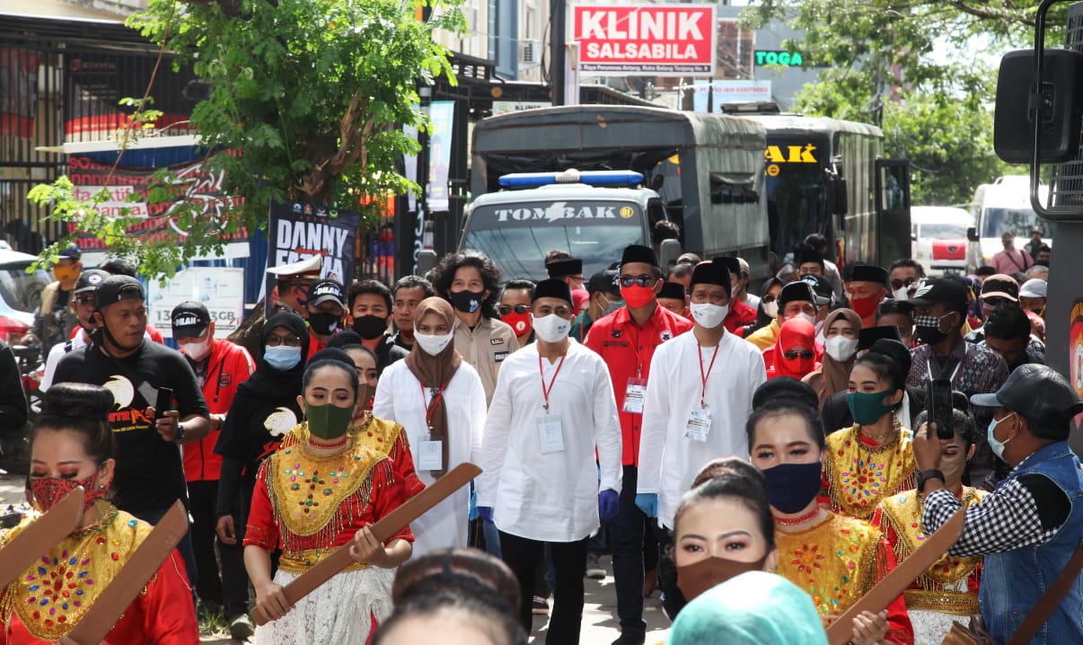 Dari pantauan awak media, Dilan didampingi tokoh dan pimpinan parpol pengusung dari PDIP, Hanura dan PKB tiba di Kantor KPU sekira pukul 14.00 Wita, Jumat, 4 September 2020. Deng Ical (Syamsu Rizal) dan Dokter Pade (Fadli Ananda) tampak mengenakan baju putih dan diiringi sejumlah pria dan wanita berpakaian adat.
