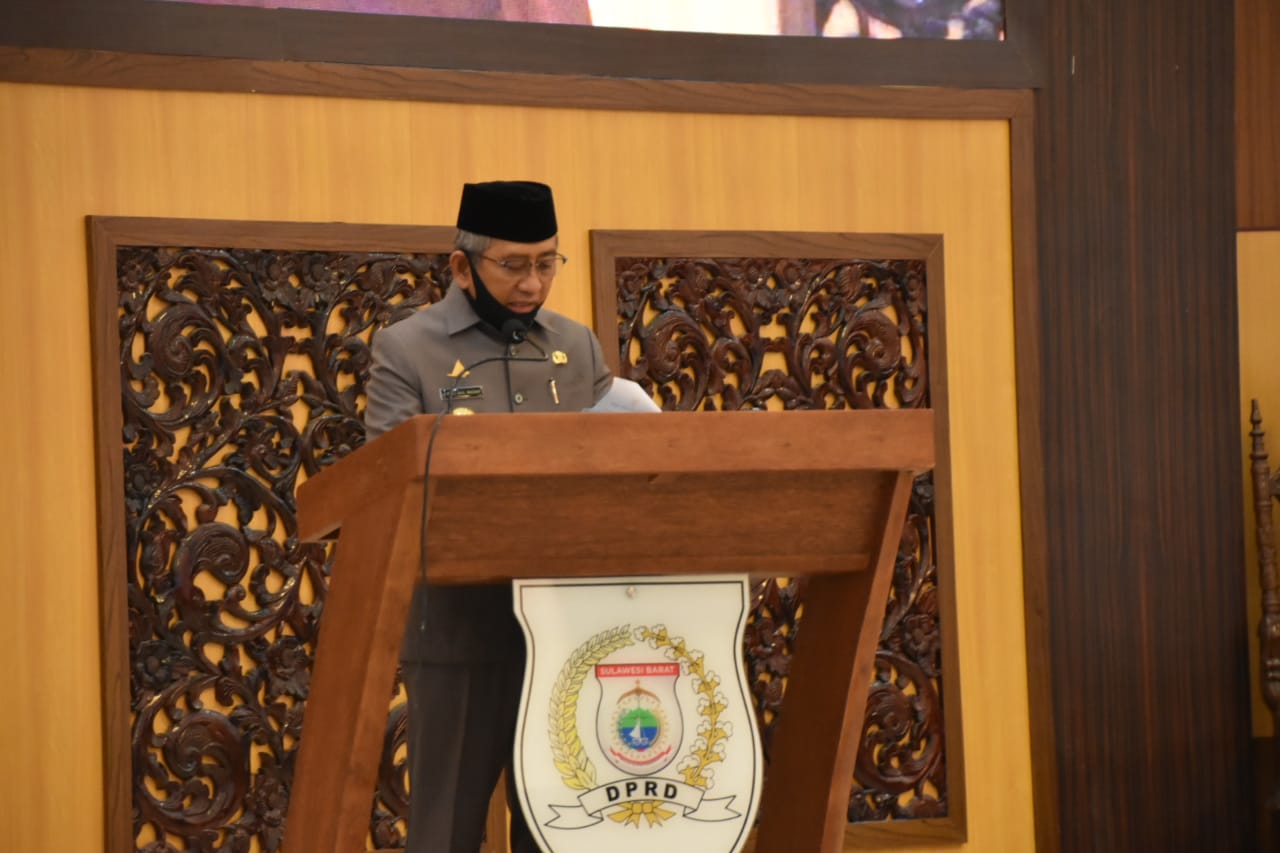 Gubernur Sulbar Ali Baal Masdar, memberikan penjelasan tentang pertanggungjawaban pelaksanaan APBD tahun Anggaran 2019 yang dirangkaikan dengan Penyerahan Ranperda oleh Gubernur Sulbar Ali Baal Masdar kepada Ketua DPRD Provinsi Sulbar Suraidah Suhardi dalam Rapat Paripurna DPRD Provinsi Sulbar, Kamis 2 Juli 2020.