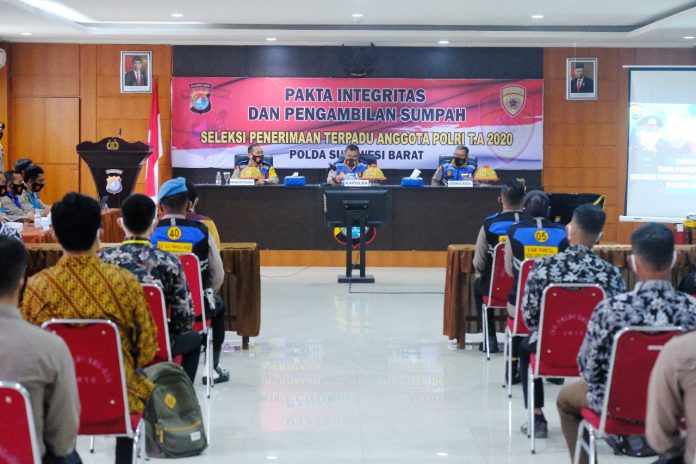 Setelah melalui serangkaian tahapan penadftaran dan verifikasi Online, Biro SDM Polda Sulbar melanjutkan ke tahap selanjutnya, yaitu penandatanganan pakta integritas dan pengambilan sumpah seleksi penerimaan terpadu anggota Polri TA. 2020 di Aula Arya Guna Polda Sulbar,Rabu (19/0820).