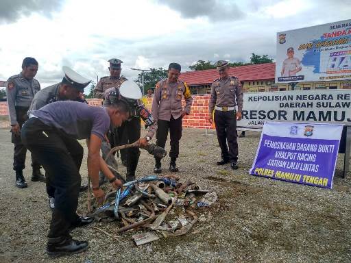 Sebanyak 42 knalpot racing dari hasil razia Satuan Lalu Lintas Polres Mateng selama enam bulan terakhir dimusnahkan, Selasa (7/7/20). Pemusnahan barang bukti tersebut dengan cara melindas, menggunakan alat berat dari dinas PUPR-PKP Kabupaten Mamuju Tengah (Mateng).