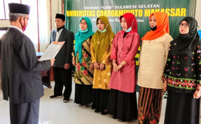 Rektor Universitas Cokroaminoto Makassar (UCM), Prof. Dr. H. Muhammad Asdar, SE,M.Si. melantik dan mengambil sumpah empat Wakil Rektor UCM, masing-masing Prof. Dr. Ir. H. Baharuddin Mappangaja, M.Sc.(WR I), Roswiyanti,SE,MM. (WR II), Dr. Ir. Suhartin Dewi Astuti, M.Si. (WR III), dan Wakil Rektor IV Sennahati, S.Sos,MM.