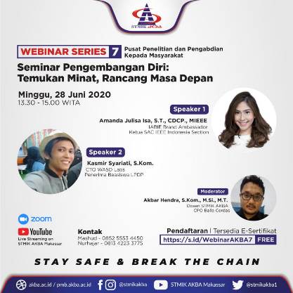 Enam ratusan lebih join peserta pada Webinar Nasional STMIK AKBA seri ke-7 di gelar Ahad 28 Juni 2020. Seminar digital ini menampilkan nara sumber juga dari jalan anak muda milenial yakni; Amanda Julisa Isa ST, CDCP, MIEF, sehari hari adalah IABIE Brand Ambasador. Demikian Koordinator Webinar Series STMIK AKBA 2020, Dra. Ratnawati, M.Si kepada media, Senin (29/6/2020).
