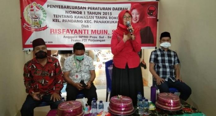 - Legislator DPRD Sulawesi Selatan dari Fraksi PDI Perjuangan Risfayanti Muin, Sosialisasi Peraturan (Sosper) No 1 Tahun 2015 tentang Kawasan Tanpa Rokok (KTR) di Kelurahan Pandang Kecamatan Panakukang, Kota Makassar, Kamis (25/6).